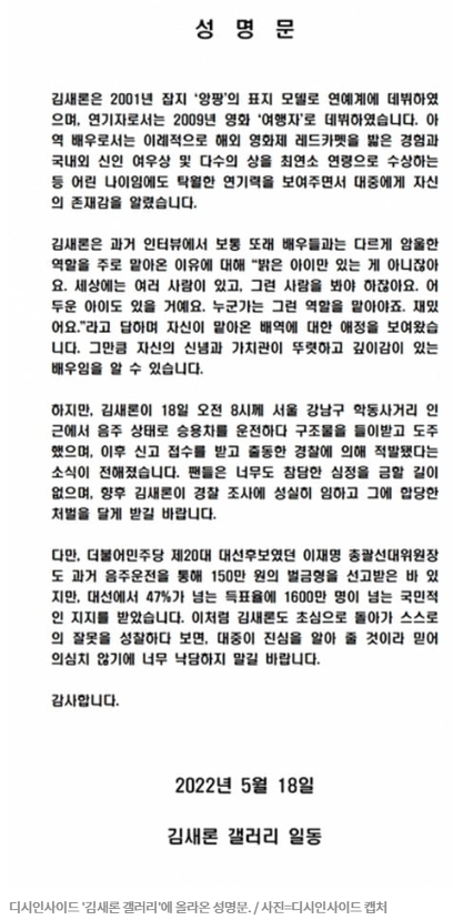 김새론 씨가 음주운전 사고를 냈던 2022년 5월, 그의 팬들은 디시인사이드 '김새론 갤러리'를 통해 성명문을 발표했습니다. 여기서 그들은 "이재명 대표도 과거 음주운전으로 벌금형을 선고받았지만, 대선에서 47%가 넘는 득표율에 1600만명이 넘는 국민적인 지지를 받았다"며, "김새론도 너무 낙담하지 말고 묵묵히 내일을 향해 걸어 나갈 것을 간절히 호소한다"고 밝혔습니다.