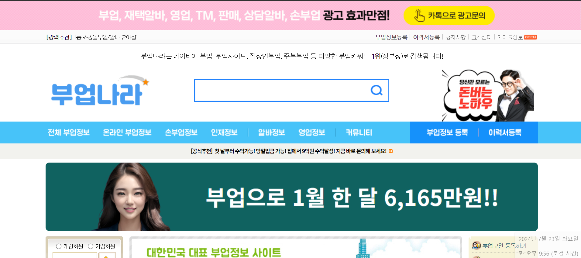 부업나라는 집에서 할 수 있는 다양한 부업 정보를 제공하는 플랫폼입니다. 이 사이트는 지역별, 급여별, 직종별로 부업을 검색할 수 있어 사용자들이 자신에게 맞는 부업을 쉽게 찾을 수 있도록 도와줍니다. 부업나라에서는 컴퓨터를 활용한 부업부터 수공예, 자료입력 등 다양한 부업을 소개하고 있습니다.