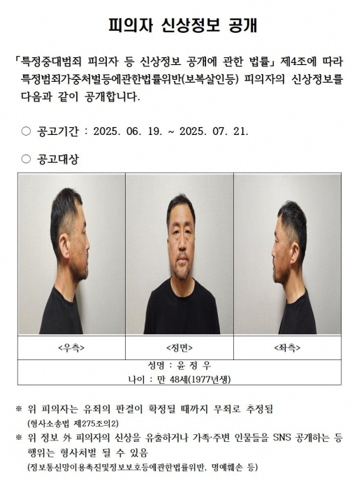 이번 신상공개는 다음 달 21일까지 진행될 예정이며, 범행의 잔인성과 피해의 중대성이 인정되고 충분한 증거가 확보되었으며, 범죄 예방 등 공공의 이익을 위해 필요하다는 판단에 따라 결정되었습니다. 특히 윤씨 본인도 신상공개 결정에 대해 별도의 이의를 제기하지 않은 것으로 알려졌습니다.