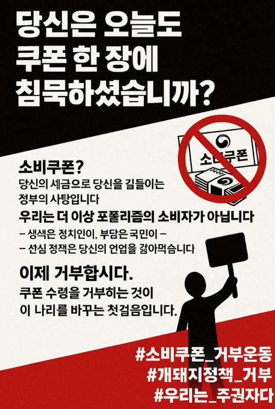 20일 소셜미디어(SNS)와 온라인 커뮤니티에는 '소비 쿠폰 거부 운동'을 촉구하는 이미지가 확산되기 시작했습니다. 이 움직임은 주로 일부 극우 성향 커뮤니티에서 시작된 것으로 보입니다.