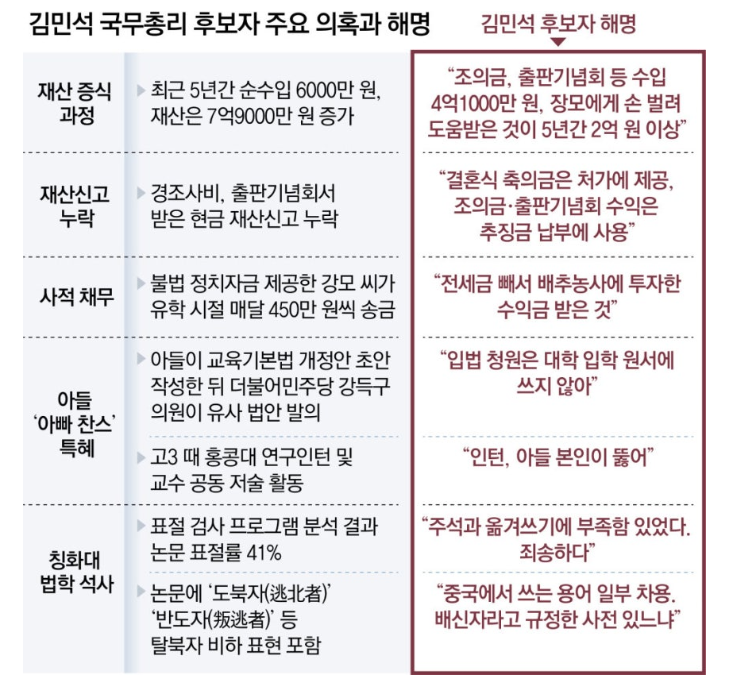 야당은 김 후보자의 재산 형성 과정의 투명성 부족, 국정 운영 역량에 대한 의문, 학위 논문 관련 논란 등을 근거로 후보자 부적격성을 주장하고 있습니다.