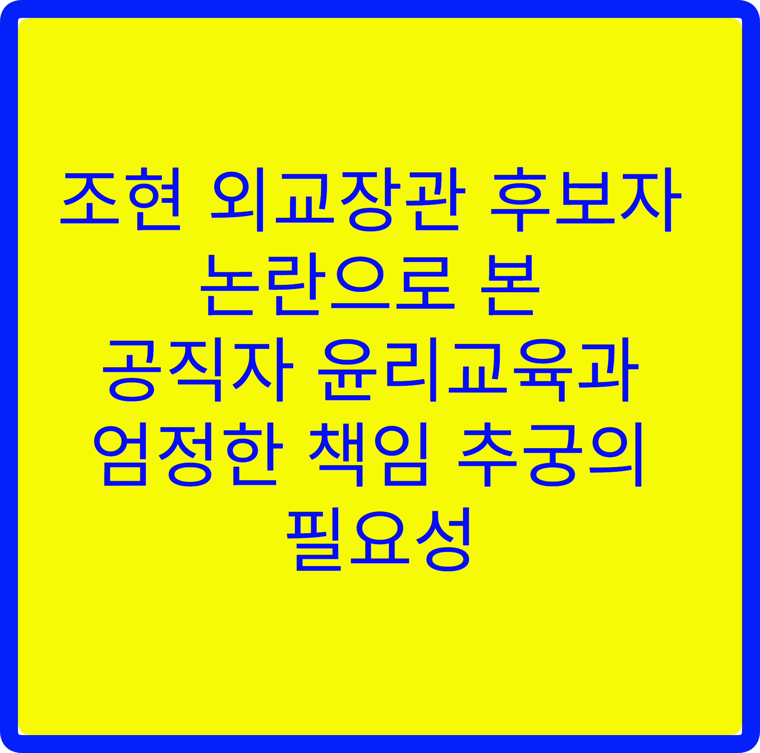 연관키워드: 조현 외교장관 후보자, 공직자 윤리교육, 부정부패 척결, 엄정한 심판, 재산신고 의무, 조현 독립생계 허위신고, 조현 가족특혜, 조현 아빠찬스, 공직자 청렴성, 무관용 원칙, 윤리의식 함양, 젊은시절 교육, 체계적 검증, 민주주의 수호, 국민신뢰 회복