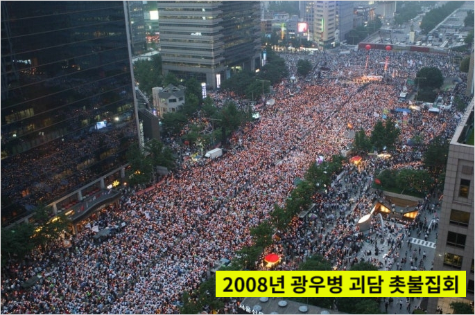 2008년 5월부터 자발적으로 광장에 모여든 시민들의 수는 최대 100만 명에 달했습니다. 이는 당시로서는 매우 큰 규모의 시위였으며, 전국적으로 확산되었습니다.