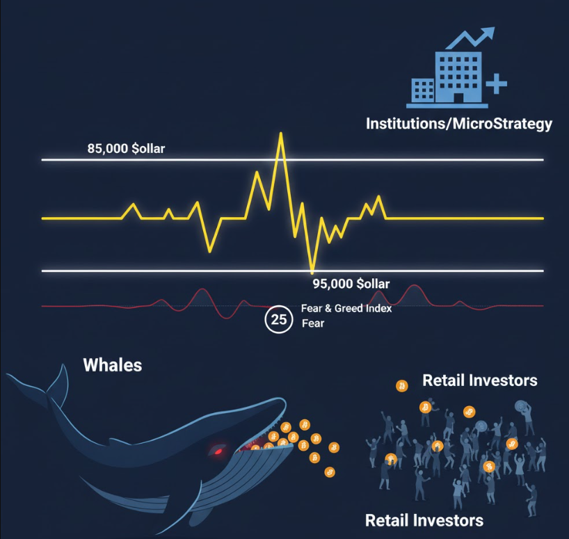 • 가격 박스권: 비트코인은 11월 말 이후 85,000달러에서 95,000달러 사이의 좁은 박스권에 갇혀 있습니다. 지난 10월 기록했던 사상 최고가인 126,198달러와 비교하면 약 30.53%나 하락한 수치입니다.