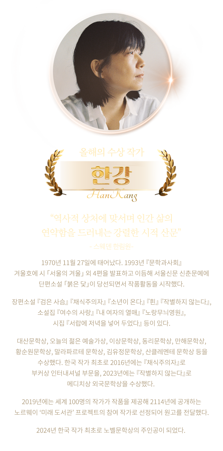 한강 작가의 노벨문학상 수상은 한국 문학의 새로운 장을 여는 계기가 될 것입니다. 앞으로도 그녀의 작품이 많은 이들에게 영감을 주고, 한국 문학이 세계적으로 더욱 빛나기를 기대합니다. 한강 작가의 다음 작품이 어떤 주제를 다룰지, 그리고 그녀가 앞으로 어떤 문학적 여정을 이어갈지 많은 이들이 주목하고 있습니다.